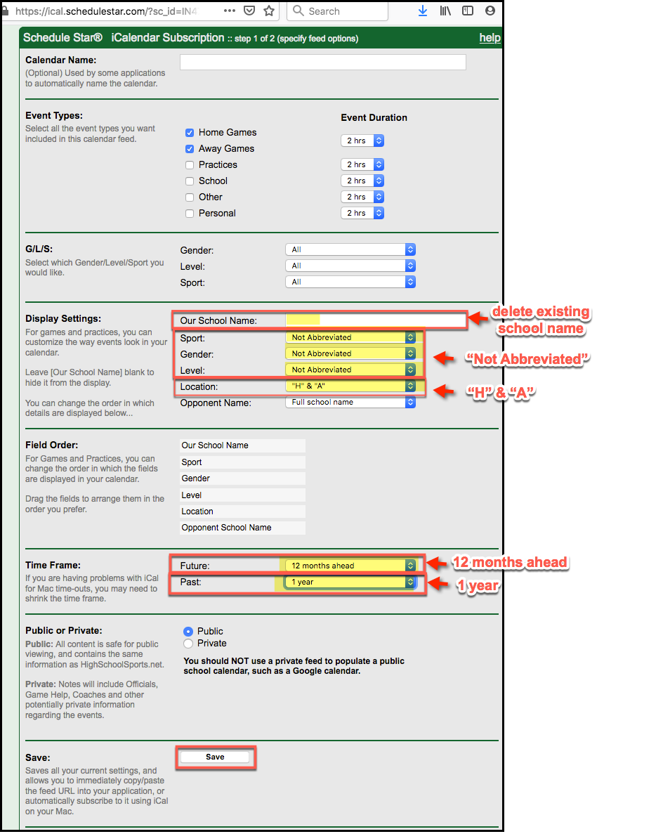 Many of the options on this page are preselected for you (see below), but you will need to change the highlighted fields. Click the 'Save' button when finished.
